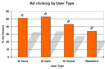 The incidence of ad clickers is different along a number of dimensions. In a previous note (Ways of Internet Access in Latin America), we noted that Internet users are qualitatively different according to the way by which they access the Internet. The following chart shows the incidence of ad clickers by the different ways of accessing the Internet. It would make sense that the younger school users are less interested in advertising. It also makes sense that people who are in the 'elsewhere' category would not spend too much of their limited and possibly expensive access time on clicking ads.