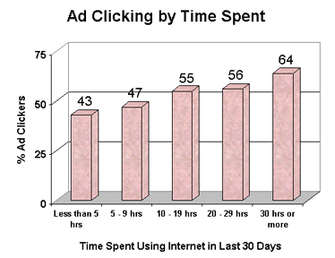 The next chart shows the incidence of ad clicking according to the amount of Internet usage time in the past 30 days. Ad clicking increases as a function of time spent using the Internet. These data must be carefully interpreted, though. On one hand, the heavy users view more pages, and this should definitely increase the probability of clicking on some ad at some time. That is to say, this measure (namely, clicking an ad within the past 30 days) is a cumulative measure that should increase with the number of exposures. On the other hand, what these data do not indicate the rate of ad clicking (say, the number of clicks per thousand impressions). For all we know, the heavy users may have significantly lower rates of ad clicking on that basis because they have been over-exposed to and conditioned to ignore banner ads.