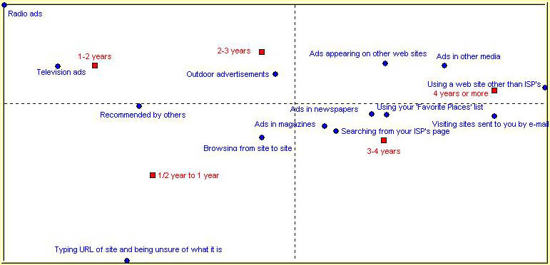 As with any marketing applications, we ask whether it is possible to segment the internet users based upon their ways of obtaining information about websites. Among the various possible segmentation scheme, we will discuss one that is simply based upon the experience of the Internet user. The following chart is a correspondence analysis map of the number of years of Internet usage versus the ways by which people find out about Internet websites.