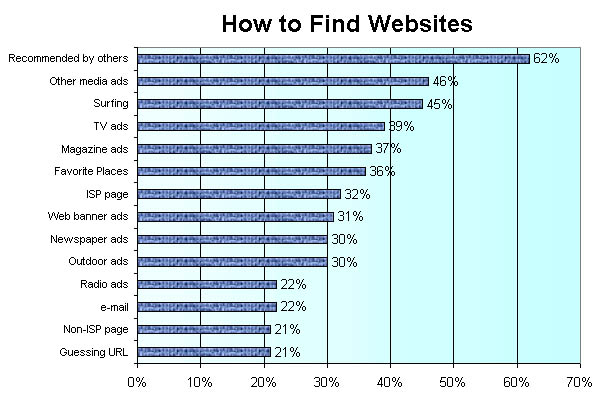 At the top of the list is 'recommendations by others.' This is a reaffirmation of the effectiveness of viral marketing. Unfortunately, one cannot just go to a media central and purchase a certain number of 'recommendations.' Viral marketing works with a quality product that is communicated to influential people who are situated in the nexus of the information network.