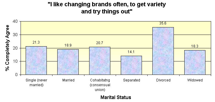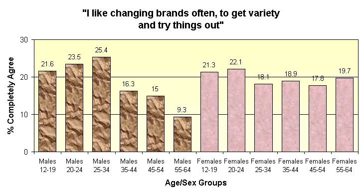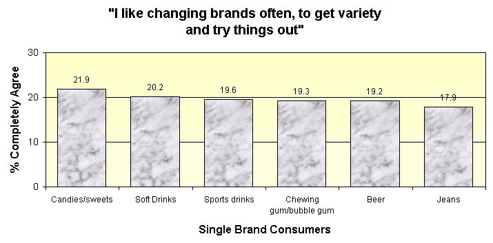 We will now cite some survey data from the 2001 TGI Colombia study. This is a survey of 7,020 persons between the ages of 12 and 64 years old conducted by IBOPE Colombia. During this survey, the respondents were shown the statement: "I like changing brands often, to get variety and to try things out." 19.9% of the respondents said that they 'completely agreed' with this statement.
