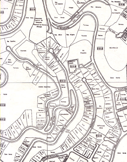 Certainly, part of that growth was accommodated by the many glitzy steel-and-glass modern skyscrapers in the central area. But the narrow valley of Diego de Losada could not be overbuilt to accommodate the exploding residential needs. Buildings began to appear on the hillsides, growing upwards to form entire barrios. Now, instead of the square city blocks, there are serpentine paths following the hillscape and criss-crossing the hillsides. The following map of another area in Caracas is an example of these serpentine paths.