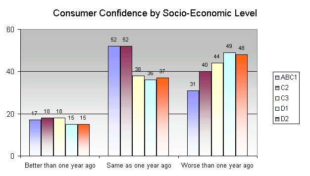We will now cite a brief piece of data from the TGI Argentina study. This is a survey of 5,946 persons between the ages of 12 and 75 years old in Argentina conducted during the first half of 2001. During the personal interview, these survey respondents were asked to provide an assessment of their current economic condition versus that of a year ago. This is the standard question about consumer confidence that is used in many countries around the world (see example).