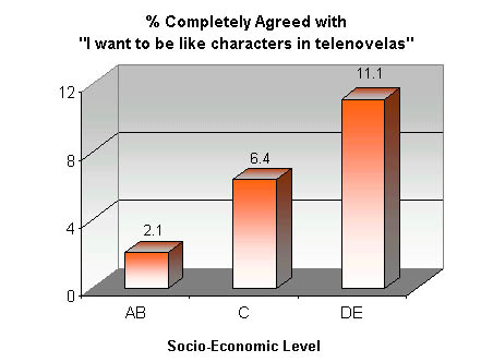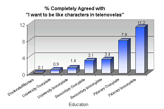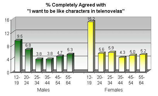 We will now cite some data from the TGI Brasil study. This is a survey of 10,624 persons between the ages of 12 and 64 years old in Brazil during 2001. During the survey, the respondents were shown the statement: "I want to be like characters in soap operas." According to the study, 6.6% of the survey respondents 'completely agreed' with that statement.