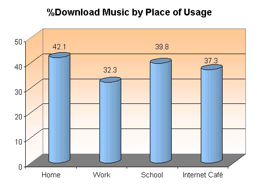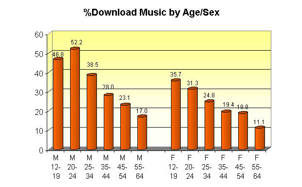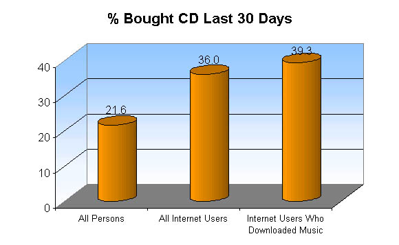 This brings us to the issue that began this article: Does downloading music cut into the sales of recorded music? In that next chart, we show the incidnece of the purchase of compact discs within the last 30 days. We note that this number includes the purchase of both legal as well as pirated copies. Among all persons 12 to 64 years old, the incidence was 21.6%. When we looked among the Internet users, who are more affluent, the incidence rises up to 36.0%. When we looked among the Internet users who downloaded music, the incidence rises up to 39.3%. However, this does not constitute incontrovertible evidence because it can be argued that the incidence among the Internet music downloaders would have been EVEN higher!