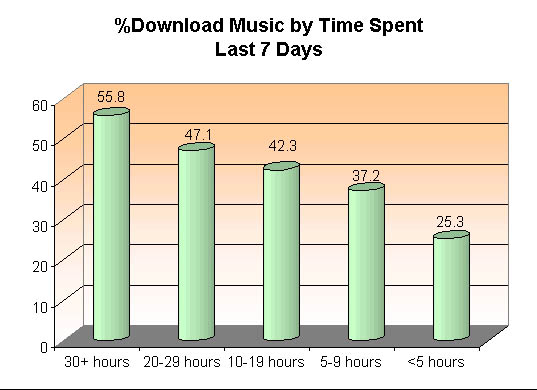 In the next chart, we show the incidences by the overall time that the people have spent on the Internet in the last 7 days. Heavier users are more likely to download music. For someone without broadband Internet access, downloading music is actually a time-consuming process, especially if there are frequency drops in the connection. Without even considering the actual downloading time, the process of searching for and then testing the quality of specific recordings can consume a lot of time. This is perhaps a point not appreciated in the debate about copyright, because it would seem that if the authentic recordings are priced reasonably, then people would rather pay than spend a lot of time searching for and downloading music. The current practice of downloading music seems to be driven by two reasons: (1) high retail prices that would make the investment of personal time to search and download music worthwhile; and (2) the packaging of music in album format with one or two 'good' songs and a dozen other forgettable fillers.