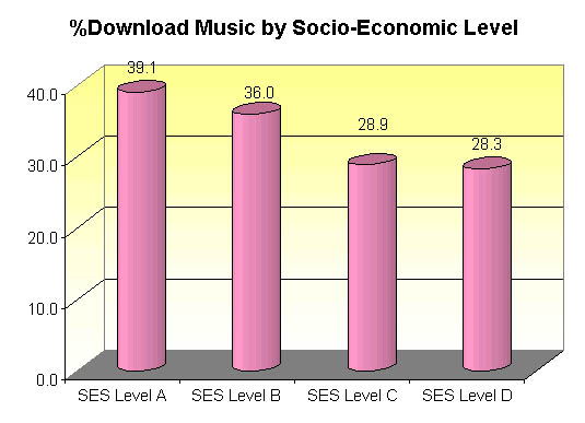 In the next table, we show the incidences by socio-economic levels (Level A=top 10%, Level B=next 20%, Level C=next 30%, Level D=bottom 40%). The incidence is an increasing function of socio-economic level. Downloading music is in fact not totally free. If one is paying for connection time by the hour, those large music files will take time and money to download. The utility of the music is increased if one has sophisticated equipment such as CD burners and portable MP3 playback devices.
