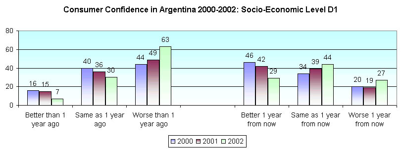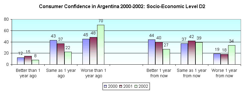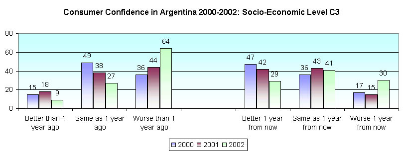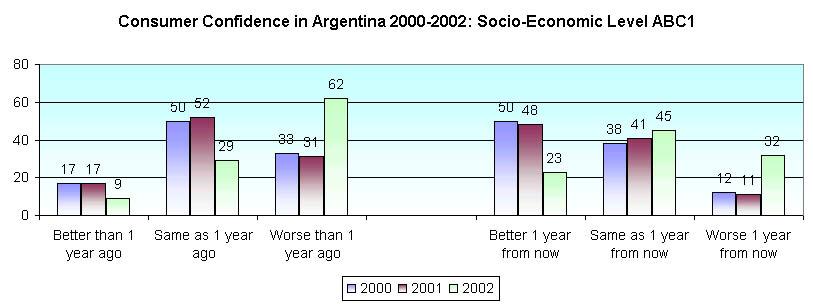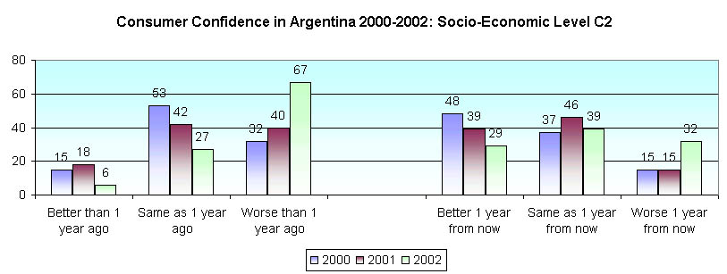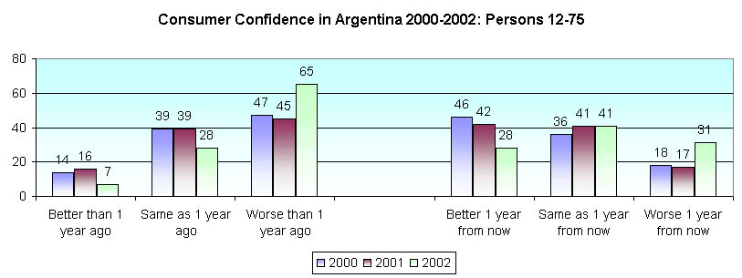 We will now cite some survey data from the TGI Argentina study. This study was conducted annually. In 2000, 11,890 persons were interviewed. In 2001, 5,946 persons were interviewed. In 2002, 5,063 persons were interviewed. In all three years, the survey respondents were persons between the ages of 12 to 75 years old. In each year, the same questions about consumer confidence were asked about the economic situation of the respondents and their families compared to one year ago, as well as their likely economic situations one year from now. These retrospective and prospective consumer confidence questions are used in many countries around the world (see example).