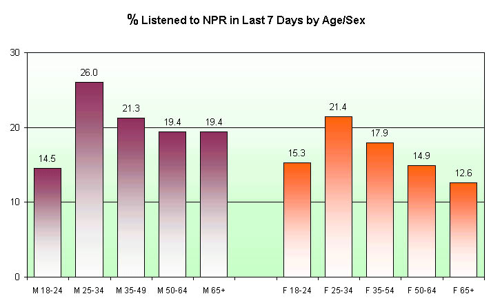 In the first chart, we show NPR listenership by age and sex. NPR listeners are more likely to be male than female, and their strongest age group is 25 to 34 years old.