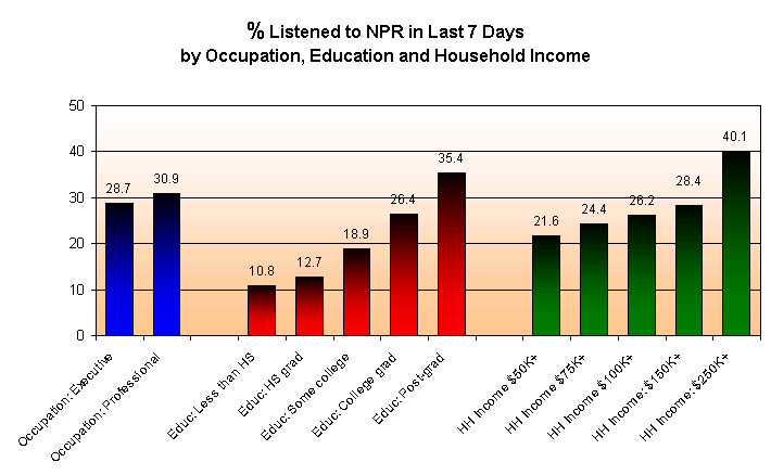 In the second chart, we show NPR listenership by socio-economic characteristics. NPR listeners are more likely to be professional/managers, better educated and more affluent. Although NPR is not about explicitly commercial in the sense of flooding airtime with radio commercials, it nevertheless depends on individual contributions and corporate sponsorship. The fact that NPR listeners are more affluent implies that they can contribute significant amounts, and so the task is to persuade them to contribute to sustain the radio programs that they like. For corporate sponsors, the NPR audience represents a highly desirable elite audience that may be difficult to reach otherwise. The affinity of these people for NPR is easily transferable to the sponsors.
