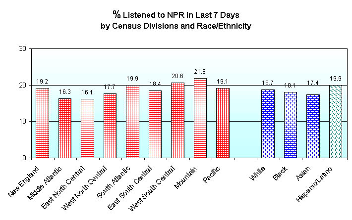 In the last chart, we show the NPR listenership by geographic divisions, race and Hispanic/Latino origin. NPR was never designed as a top-down system that allocates radio stations uniformly across the land, and so it is perhaps something of a miracle that this spontaneously self-organized network is reasonably evenly distributed. This speaks to the fact that there is demand for NPR programming in all parts of the country. And even though NPR has no specific racial or ethnic orientation, it also manages to be fairly popular across these groups.
