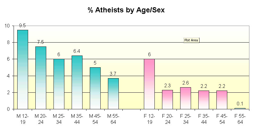 In the next chart, we show the incidences by socio-economic level and educational level. There does not appear to be much difference by socio-economic level. By education, the highest incidence occurs among those who have received post-graduate training, such as obtaining doctorate or master degrees. Religious faith is perhaps hardest to come by for intellectuals, for they have been trained to reason which is not applicable to an act of faith. A famous example is Blaise Pascal's wager: '"If God does not exist, one will lose nothing by believing in him. But if he does exist, one will lose everything by not believing."
