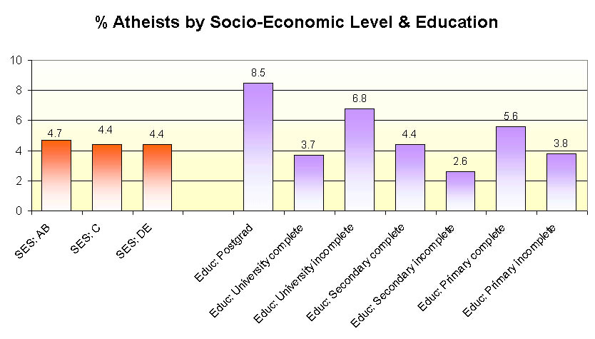 In this article, we will not prove if God exists or not. The reality is that we would not know how to do that even if we wanted to. Nor we will try to establish if religion is right or wrong. We will report some survey data taken from the 2002 TGI Brasil survey. This is a survey of 5,312 persons between the ages of 12 to 64 years old who were interviewed in Brazil during the first half of 2002. During this survey, the respondents were asked to classify themselves according to their religious beliefs. Among the possible answers are "Atheist and/or don't have religion."