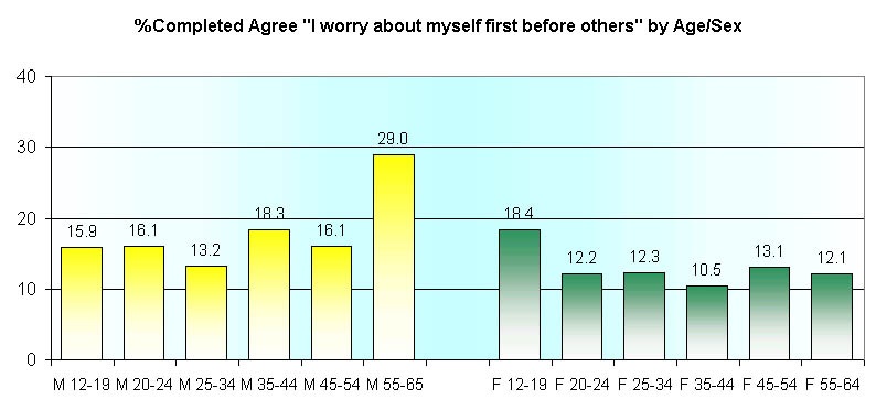We will now cite some survey data from the TGI Brasil study. This is a survey of 5.312 persons between the ages of 12 to 64 years old who were interviewed during the first half of 2002. During the survey, the respondents were presented with the statement 'I worry about myself first before others.' According to the survey results, 15.0% of the respondents said that they completely agreed with the statement.