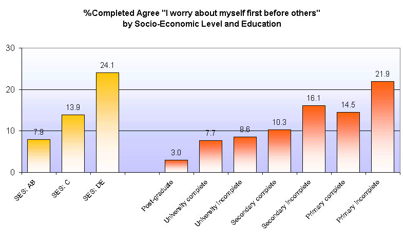 A much more interesting breakdown occurs in the next chart. Contrary to the image of the greedy exploitative capitalist, the incidence decreases up the socio-economic scale. Of course, this is just a sad statement that when one lives below the poverty line, any suggestion that one should worry about others first is an obscene idea.