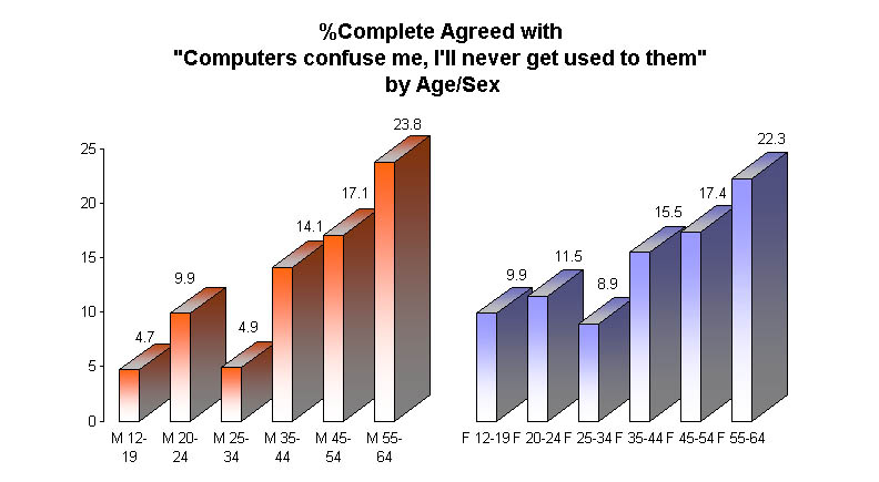 In the next table, we show the agree rates by age/sex groups. The most readily discernible trend is that older people are most likely to agree with the statement. All the reasons that we previously enumerated are applicable here. A less prominent feature is that there is a slight bump in the 20-to-24-year-old groups. There are the people who have just entered the labor force, and now facing the fact that computer savviness is becoming critical to successful careers.