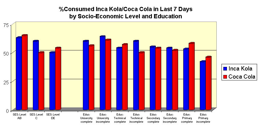 In the next chart, we show the incidences by socio-economic level and educational level. The most obvious advantage for Inca Kola occurs for the middle class (Level C). We note that the relationship between Inca Kola and Coca Cola is not one of antagonistic competition, since the two companies signed a joint venture agreement in February 1999.