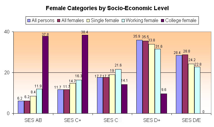 In the next chart, we show the distribution of these categories by socio-economic level. The definition of these socio-economic levels follow the national system, whereupon people are classified into the classes known as AB, C, C+, D+ and DE. Within the general population, the percentages of these categories are 6.2%, 11.7%, 17.7%, 35.9% and 28.4%. Within all females, the percentages are about the same. But as soon as we get to single females, we see that they are slightly more likely to be upscale. The likelihood increases significantly for working females. And for female college graduates, they were almost surely upper- and middle-class. So the first conclusion that we can draw is: if being single, employed and educated is a lifestyle choice, then it is tied in with better socio-economic circumstances.