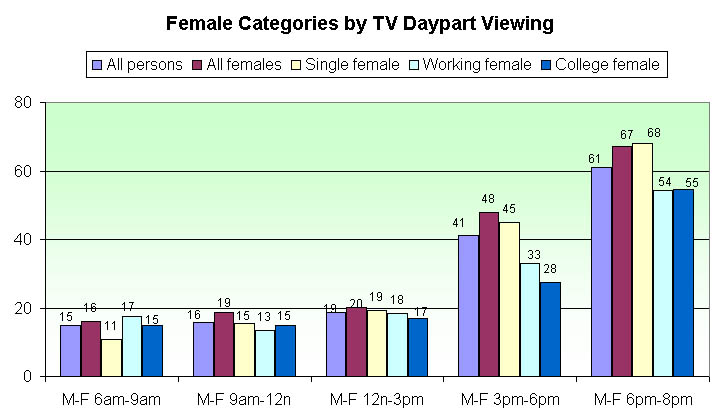In the next chart, we show the female categories by those people who watch television during certain weekday dayparts. As a whole, women watch slightly more television than men and this is practically a universal phenomenon. But what we find here is that the television viewing audience has fewer working females and fewer female college workers. Understandably, some of these women are too busy being economically active to sit around and watch television.