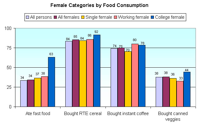 In the next chart, we show the female categories by food consumption. With distinction, the female college graduates are more likely to patronize fast food establishments as well as purchase instant ready-to-eat foods and canned food. Likewise for the working females. The case of single women is somewhat different, because this category in fact contains women of all ages (that is, the 12 year old girl as well as the 64 year old grandmother). But the story that is drawn out here is not that these professional working women and educated women are negligent. Once upon a time, it may have been a symbol of honor for the housewife to spend a third of her day on grinding corn by hand to make tortillas (see Jeffrey M. Pilcher's ¡Que vivan los tamales!: Food and the Making of Mexican Identity). Today, that form of labor is recognized to be both unproductive and oppressive, both at the personal level as well as the collective level (that is, think about the contribution of that labor towards the gross domestic product). And the same can in fact be said about all the mass-produced goods that have displaced traditional handicrafts.