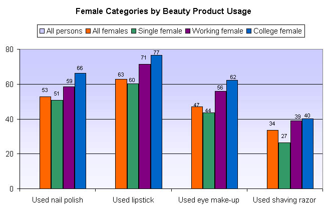 In the next chart, we show the female categories by beauty product usage. We note again the single women category covers females of all ages between 12 to 64. The data here would suggest that it is a falsehood that these women 'rarely shave their legs' and all that. In fact, we would have taken the data here as being obvious for upwardly mobile professionals, regardless of gender, since appearance and presentation are usually considered required packaging.