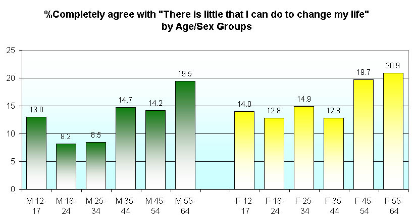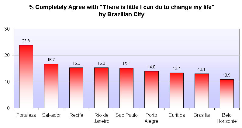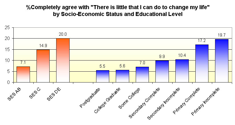 We will now look at some survey data from the TGI Brasil study. This is a survey of 10,624 persons between the ages of 12 to 64 years old interviewed during 2002 in the major metropoiltan areas of Brazil (Brasilia, Belo Horizonte, Curitiba, Fortaleza, Porto Alegre, Recife, Rio de Janeiro, Salvador, Sao Paulo as well as other smaller cities in Sao Paulo state and the south/southeast region. The respondents are presented with the statement "There is little that I can do to change my life" and 13.9% of them said that they completely agree with it. Another 19.4% said that they 'somewhat agreed' with it.