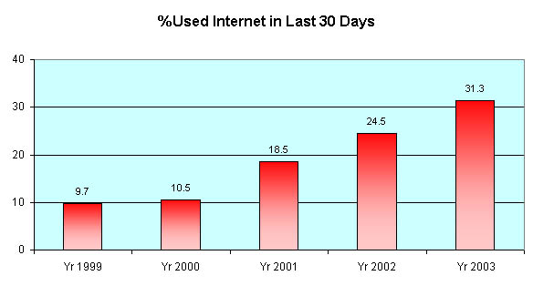 There are many ways to define who the Internet users are. A question such as "Are you an Internet user?" may be confusing, as there is no time frame involved. So an objectively clear question would be something "Have you used the Internet in the last 30 days?" The numbers for the last five years are shown in the chart below.