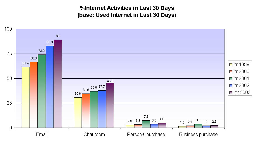 The more interesting data are about how Internet has qualitatively changed over time. The next chart shows the major activities among the Internet users.