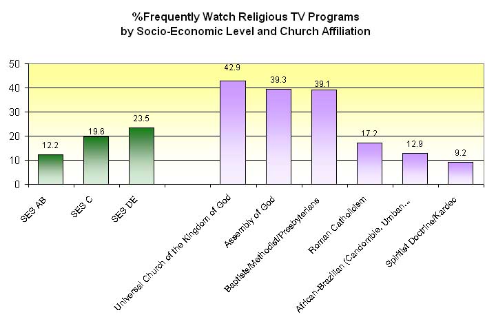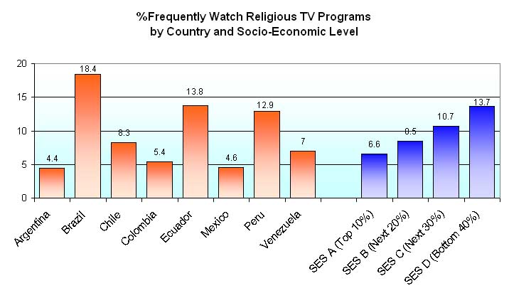 We will now cite some survey data from the 2003 TGI Latina study. This is a survey of 56,566 persons in eight Latin American countries. Within the TGI Latina study, 10.9% of the survey respondents said that they frequently watch religious television programs. The breakdowns by country and socio-economic level are shown in the following chart.