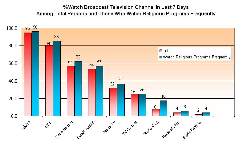 We can be more precise by looking at the television channels that were watched, as shown in the chart below. This is not a situation in which religious program viewers watch those programs to the exclusion of all other types of programs. Rather, religious program viewers seem to watch more of all other channels. In Brazil, Rede Vida is a religious channel. This is the channel with the highest viewing differential with respect to the total population.
