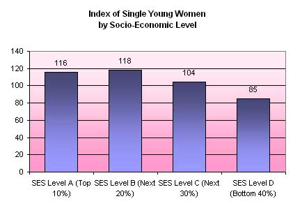 We will refer to some survey data from the 2003 TGI Latina study. Within this study, there are 8,586 women 18-34 of which 3,561 are single (never married). In the following chart, we have expressed our numbers in terms of indices. For example, within the total sample of women 18-34, 9.1% are in SES Level A. Within single women 18-34, 10.6% are in SES Level A. The index is defined as 100 x 10.6 / 9.1 = 116. Thus, an index of 100 means that the incidence is the same; an index of over 100 means that there are more within the single young women and an index of less than 100 means that there are less within the single young women. This chart confirms that singlehood is higher in the upper socio-economic levels and less likely in the lowest socio-economic level.