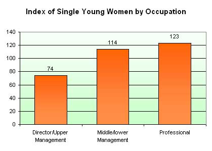 The next hypothesis relates to the kinds of jobs that are open to single women. The stereotypical image is that a single woman has to be strong, self-confident and competent. According to the following chart, single women are more likely to occupy the middle/lower management and professional ranks. However, there is still a great barrier for single women to become senior management. Within young women, there is a glass ceiling effect.