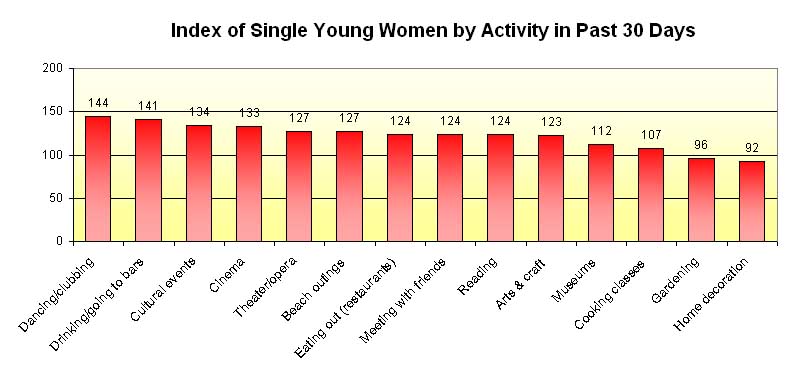 Our next hypothesis pertains to this question: "Do single women have more fun than married women?" That surely must depend on the definition of 'fun'. Looking at the next chart which is about various leisure activities, --- if you want to define 'fun' as going out for some dancing at clubs or drinking in bars,, then single women get much more.