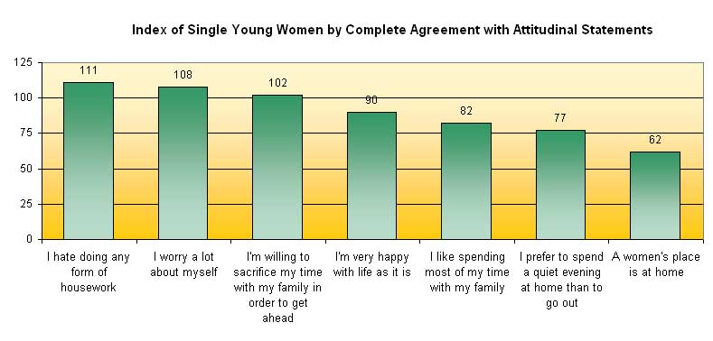 Clearly, life cannot be solely about going to clubs or getting intoxicated. So the critical question ought to something like, "Are single women happy about their situation?" The following chart shows their responses to a number of attitudinal statements. There is a great deal of sociological and psychological theory behind --- single women resent being confined to household (see Machismo in Latin America), they don't like housework and they don't think greatly of spending time with the family. That may explain why they prefer to stay single, and yet there is still an undercurrent of anxiety about the solo life.
