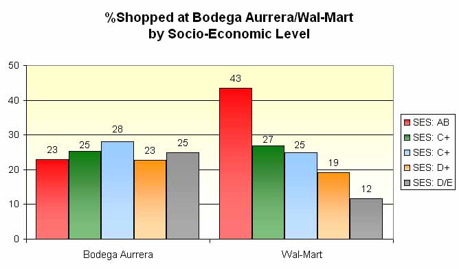 We will now refer to some survey data from the 2004 TGI Mexico study. This is a survey of 4,181 persons between the ages of 12 to 64 years old in Mexico. Within this study, 3,888 respondents classified themselves a principal shoppers in their households. Among these principal shoppers, 21% have shopped at a Wal-Mart store in the past 12 months. In addition, another 24.5% have shopped at a Bodega Aurrera, a warehouse-style discount chain owned by Wal-Mart. The chart below shows the incidences by socio-economic level. The Bodega Aurrera stores have a distinctily different profile from the Wal-Mart stores.