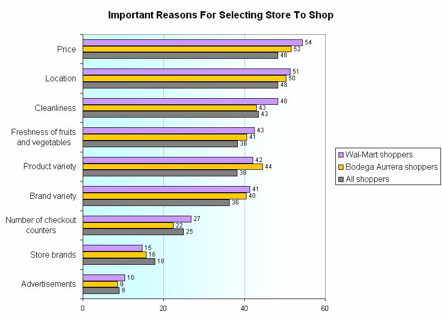 So why do Mexicans patronize the Bodega Aurrera and Wal-Mart stores? This is the bottomline. In the next chart, we show a partial list of the important reasons listed by all the principal shoppesr and then separately by those who have patronized Bodega Aurrera and Wal-Mart. For everybody, the most important reason is 'price' and Bodega Aurrera and Wal-Mart are highly competitive in this regard. In the end, as much as some Mexicans may not like the Wal-Mart stores for nationalistic reasons, there are compelling economic and consumerist reasons why they are so popular.