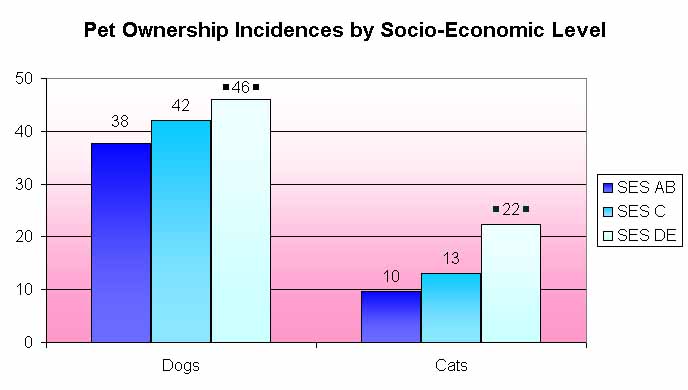 The chart below showed the incidences of pet ownership separately by socio-economic level. This incidences increased down the socio-economic ladder, so pet ownership is distinctly not a luxury item.