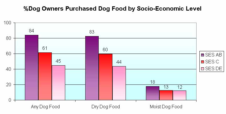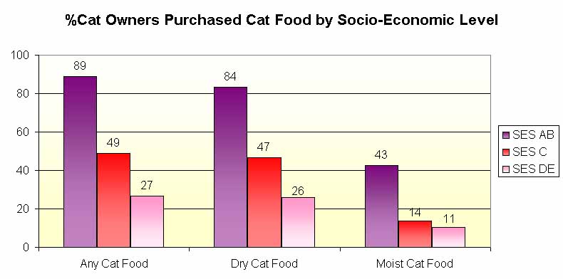 Why do some pet owners buy pet food and others don't? The two charts below show that a major driving factor is the socio-economic level. For a household living near subsistence level, the cost of pet foods will erode the family's own food budget, and it is 'inhumane' to prioritize the pets above the humans. This is a straight economic case, and certainly poses a problem for the pet food marketers -- there are indeed large number of pet owners in the third-world developing countries, but there people are often those who can ill afford to purchase pet foods.