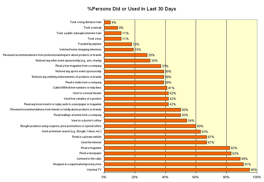 In the following, we will illustrate some of the basic premises of channel planning. We will use the Compose database compiled by MARS. This is a survey of 2,249 adults in the United States who were surveyed by mail during late 2005. For starters, we will show the usage for some of the communication channels in the Compose study. Why do we care about a long-distance train? Because this is an opportunity for certain types of communication message while the consumer is stuck in a closed environment without access to many of the other communication channels.