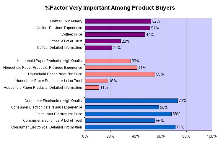 Next, we show some obvious facts. The overall idea is that not all products are alike. The table below shows the percentage of product buyers who regard a list of factors or attributes as being "very important" in their purchase decisions. When it comes to coffee, it is the price, quality and previous experience and not many people care too much about the details of what is inside their coffee. When it comes to household paper products, it is the price that drives the purchase decision above all; a lot of consumers probably have several brands that they consider interchangeable and will look for the cheapest one on any shopping excursion. When it comes to consumer electronics (such as mp3 players, television sets, etc), the consumers need to have plenty of detailed product information plus good quality and price.
