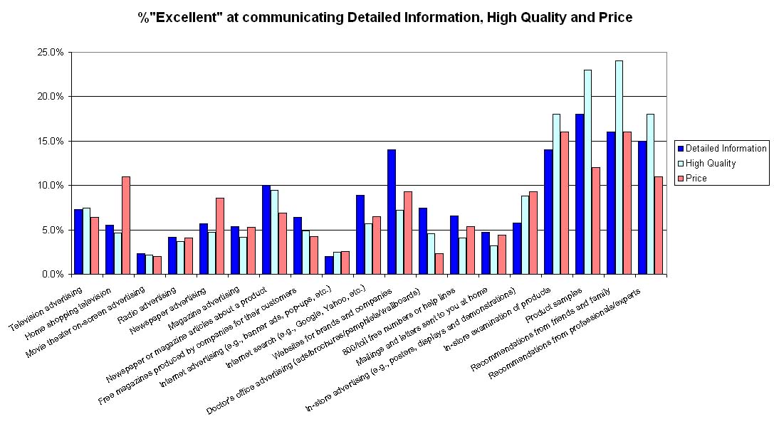 The following chart shows how a selected list of communication channels can communicate detailed information, high quality and price excellently to consumers. Relatively speaking, television may be the biggest medium but its communicative attributes are not outstanding. For example, if you want detailed information and quality, television is bested by newspaper/magazine articles, Internet searches, company websites, in-store examinations, product samples and personal recommendations. If you want some price information, television is bested by home-shopping channels, newspaper advertising, company websites, in-store advertising, in-store examinations, product samples and personal recommendations.