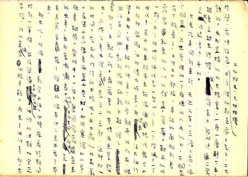 隨後漸漸走入黑暗的小街小巷,一腳高一腳低,回到蔡家。樓上有一桌牌,閔先生他們就在樓下坐了一會,我倒了兩杯開水上來,我自己也捧了一杯開水,坐在昏黃的燈光下。我對他們並沒有多少友誼,他們對我也不見得有好感,可是這時候我看見他們總覺得有一種依戀。