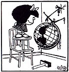 The contents of the chapters are sufficiently disparate that we cannot hope for a single, coherent discussion. Here, we will focus on the discussion of Mafalda (for more information, see the Mafalda links) in Chapter 4. The comic strip Mafalda was created by the Argentine cartoonist Quino (the pseudonym of Joaquin Salvador Lavador) in 1964 and ran on various newspapers and weeklies before Quino discontinued the series in 1973. However, that did not mean the end of Mafalda. More than twenty-five years later, Mafalda is still immensely popular throughout Latin America through a multi-volume collection, which has gone through numerous reprints.