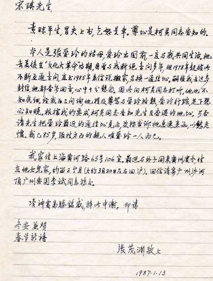 There were several different issues in the personal letter. There was an update on Mae Fong Soong's treatment for stomach cancer. The subject of the controversy about "Xiao Ai" was brought up again, with the warning that Eileen Chang could not afford to give cause for a discussion of her 'position' and therefore a brief statement would be appropriate. There was also a letter from Eileen Chang's aunt sent to Stephen Soong seeking to re-contact Eileen Chang (see below):