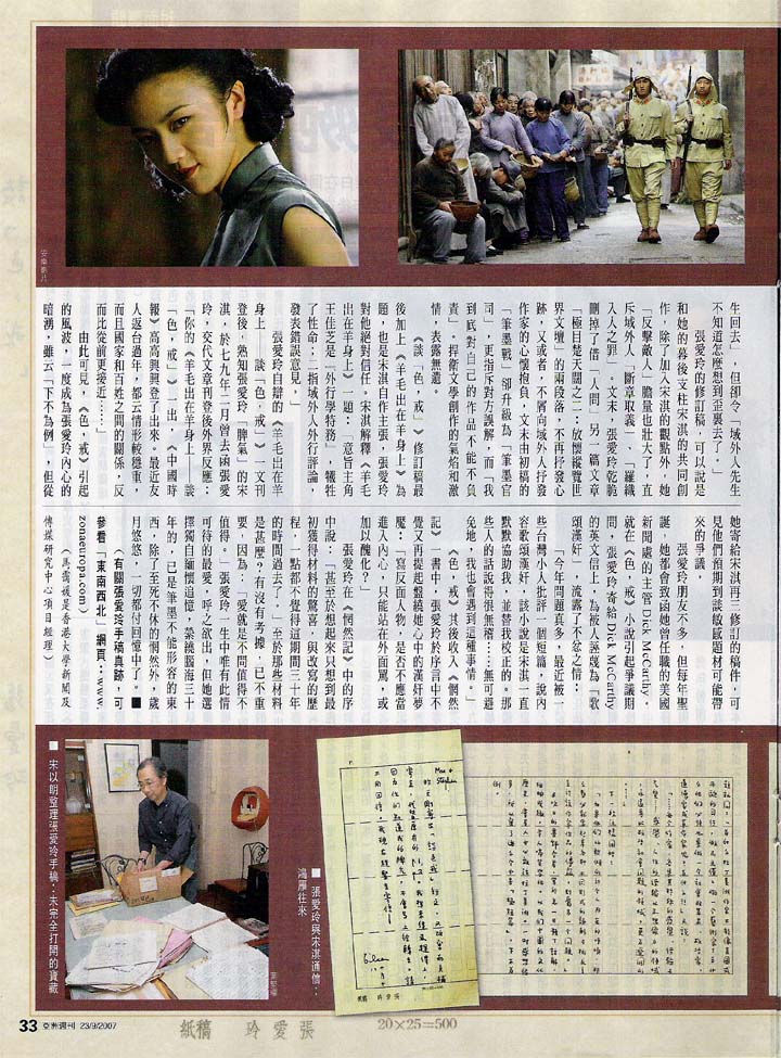李安新片《色﹐戒》奪得威尼斯電影節金獅獎﹐片中真情假愛﹐震懾全球觀眾心神。但更震懾的是當年張愛玲為原著小說《色﹐ 戒》自辯的手稿近日曝光。這份手稿要洗刷外界評論對“歌頌漢奸”的指控。張愛玲前夫胡蘭成是汪政權高官的往事又浮現﹐當年香港作家宋淇夫婦與張愛玲書信往 來商討反駁文章過程﹐展現中國文學史的重要一頁。