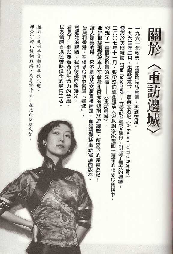 In March 1963, Eileen Chang wrote the English-language travelogue (The Return To The Frontier) which was published in the American magazine (The Reporter). This essay caused reverberations in the literary world of Taiwan.
