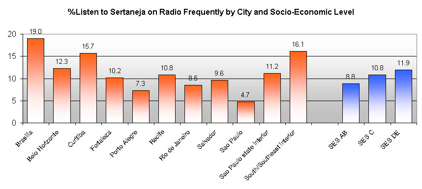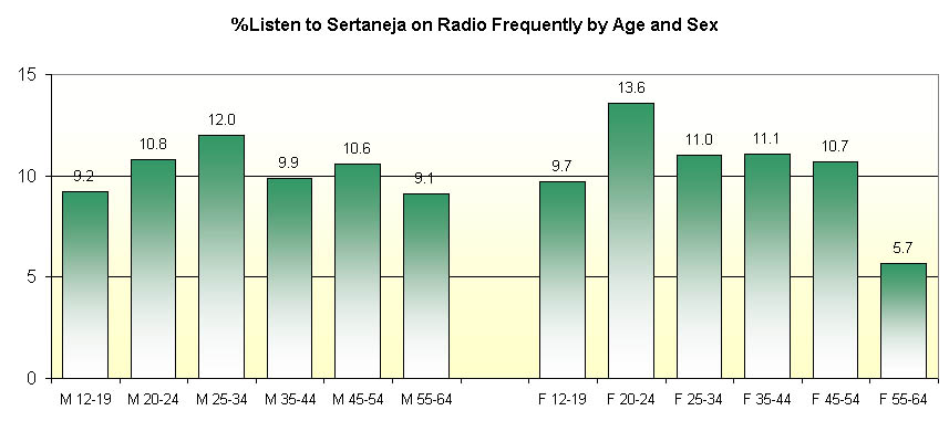 But just popular is sertanejo in Brazil? We will cite some survey data from the TGI Brasil study. This is a survey of 10,624 persons between the ages of 12 to 64 years old conducted during 2002. Within this survey, the respondents were asked if they listened to sertanejo on radio frequently. According to the survey results, 10.5% of them said that they listen frequently.